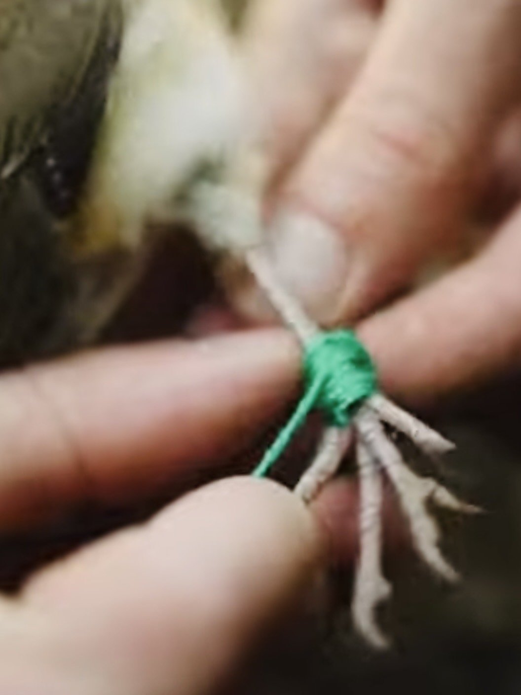 Bird leg with yarn entanglement