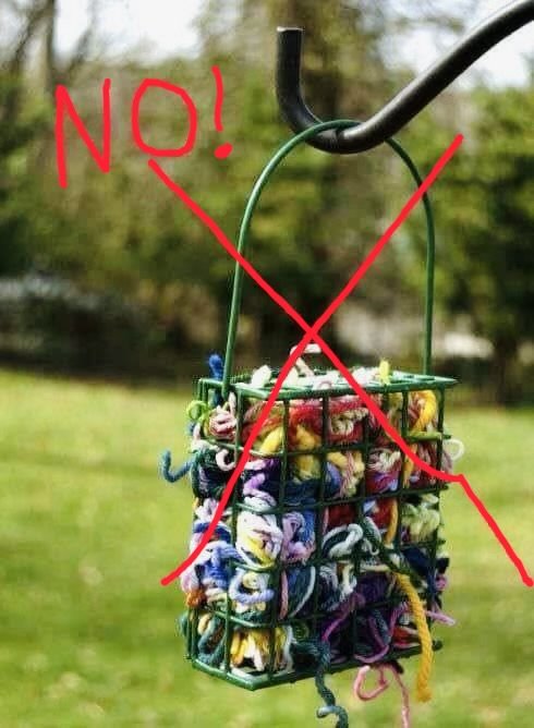Many “experts” on the internet suggest we help by offering bits of yarn, string, human hair or alpaca and cotton fibers (sold in balls at some stores). This is not a good idea.